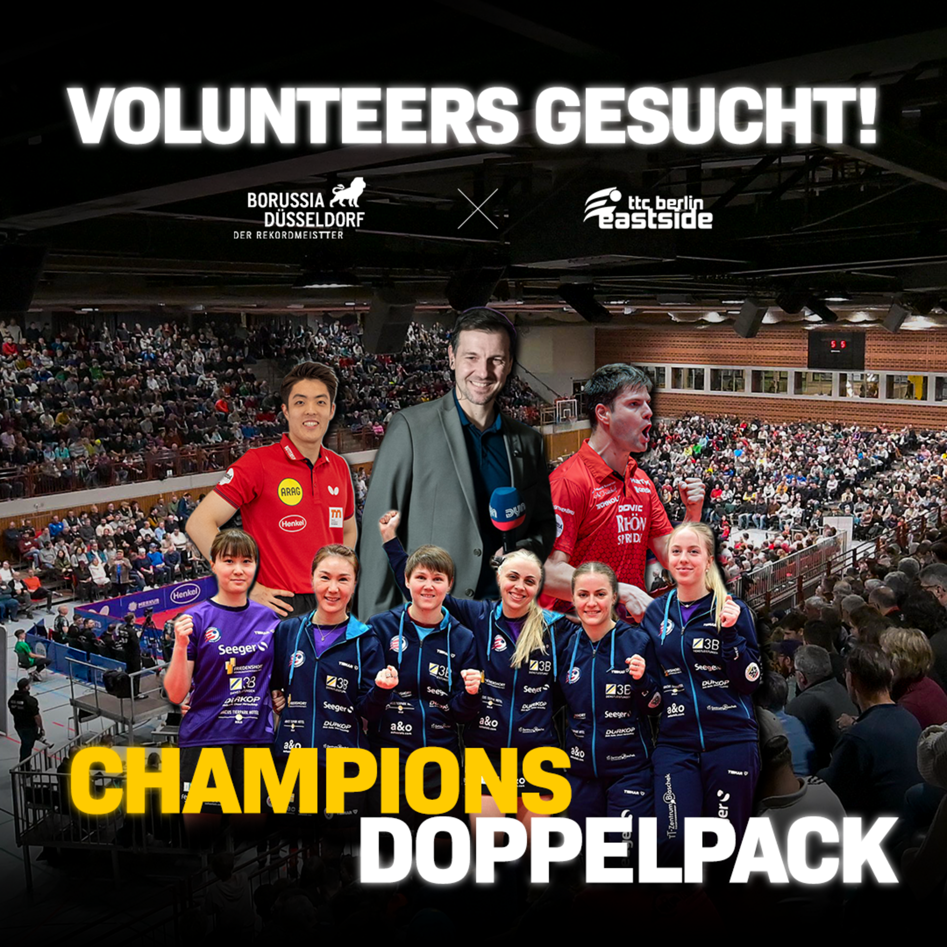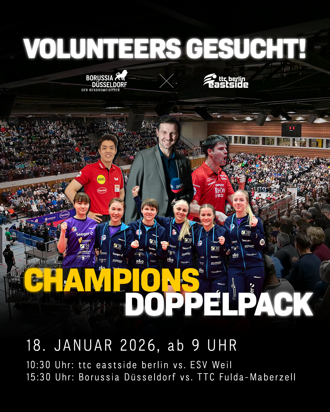 Für den CHAMPIONS DOPPELPACK – einen einzigartigen Tischtennis-Bundesliga-Doppelspieltag der Extraklasse – suchen wir rund 50 engagierte Volunteers, die dieses nationale Top-Event gemeinsam mit uns möglich machen.