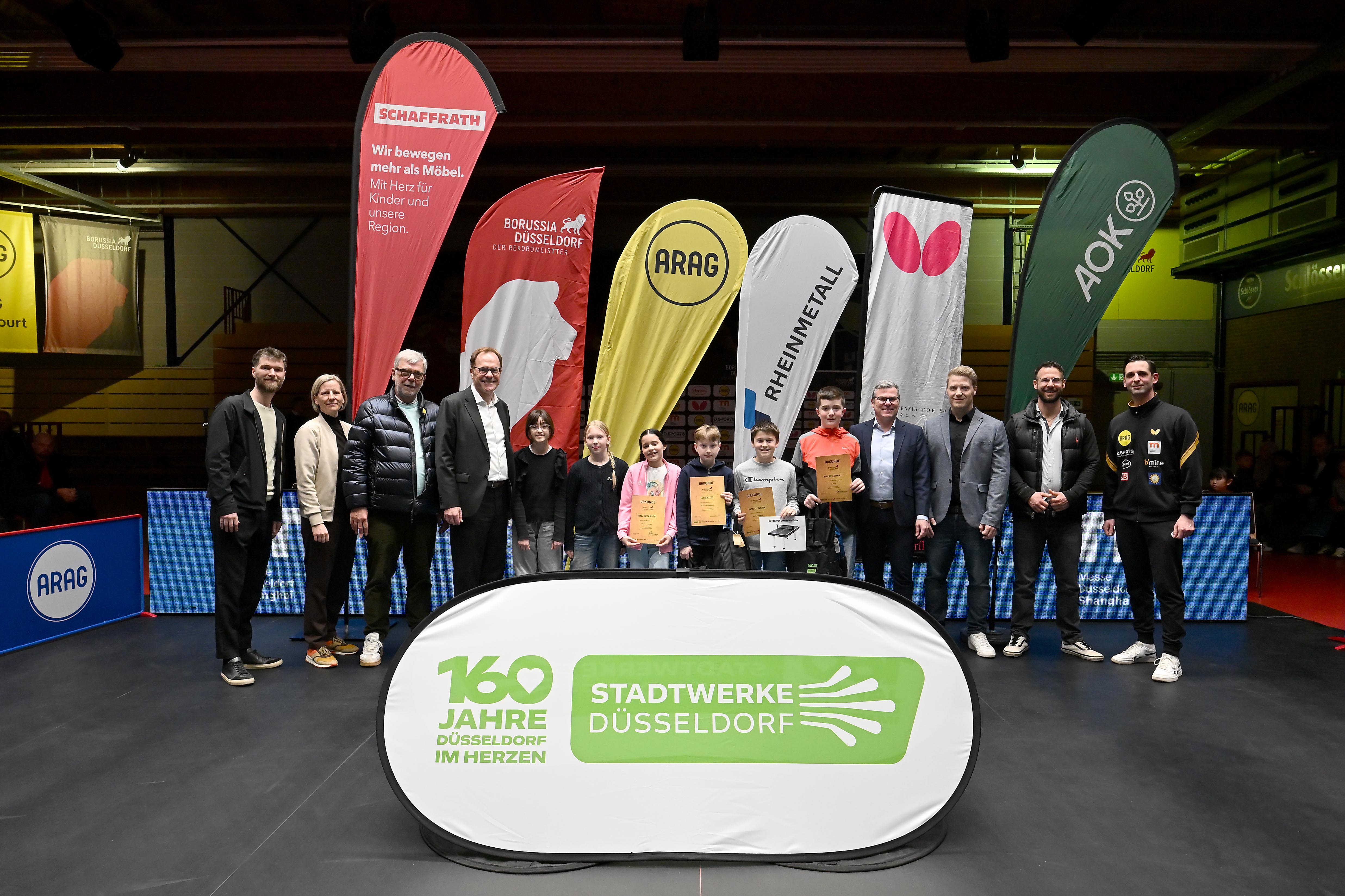 Kurz vor dem ersten Aufschlag des heutigen Bundesliga-Duells zwischen der Borussia und Bad Königshofen überreichten Oberbürgermeister Dr. Stephan Keller und Alexander Schilling, Geschäftsführer Borussia Düsseldorf, den Siegern die Pokale, tolle Sachpreise der Sponsoren sowie einen Midi-Tischtennistisch für ihre Schulklassen. Neben der diesjährigen Pausenkönigin und dem Pausenkönig belegten bei den Mädchen Mascha Blanusa und Ennie Albertz sowie bei den Jungen Louis Clees und Max Heilmann die Plätze zwei und drei.